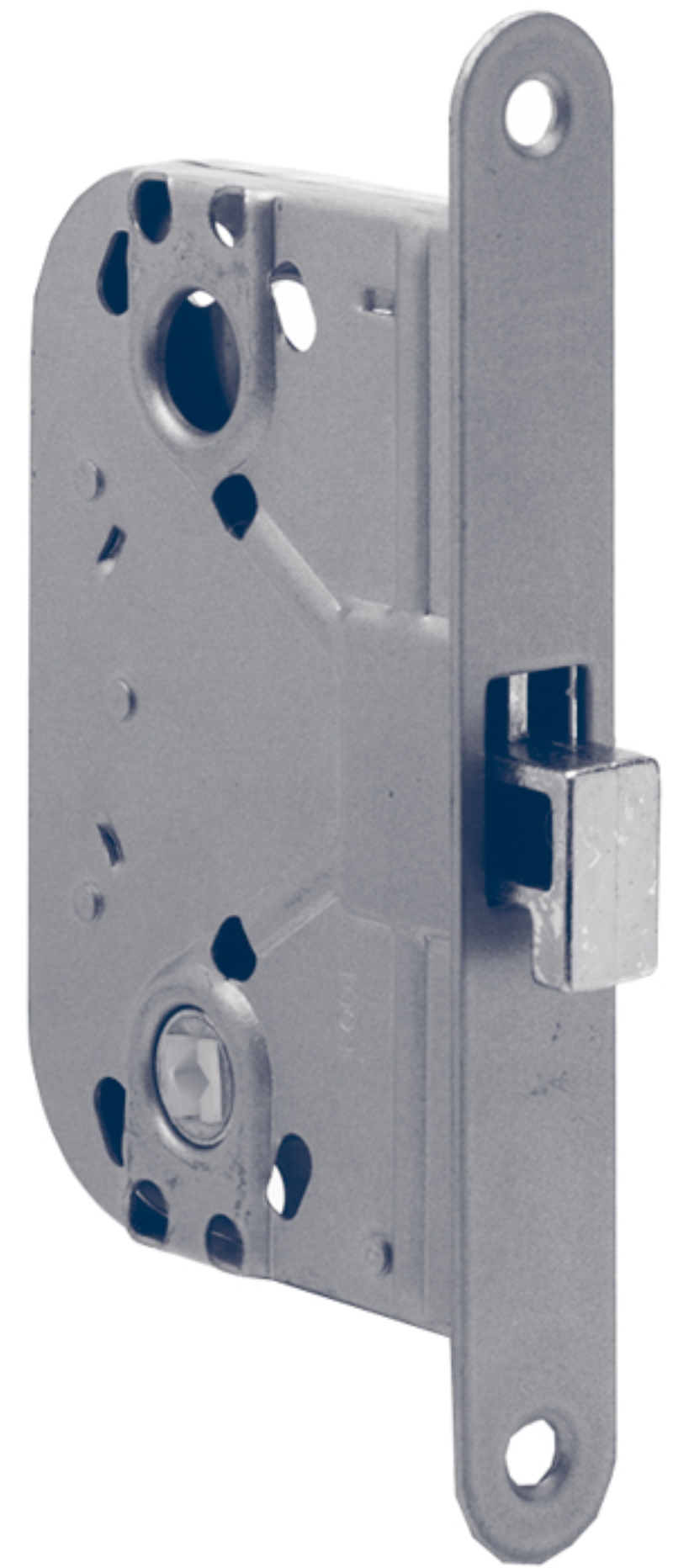 Lock box with latch bolt. For sliding doors for interior doors as well as bathroom and toilet doors. Supplied with strike plate for recessing into frame. Fits toilet fittings, item no. 17576
