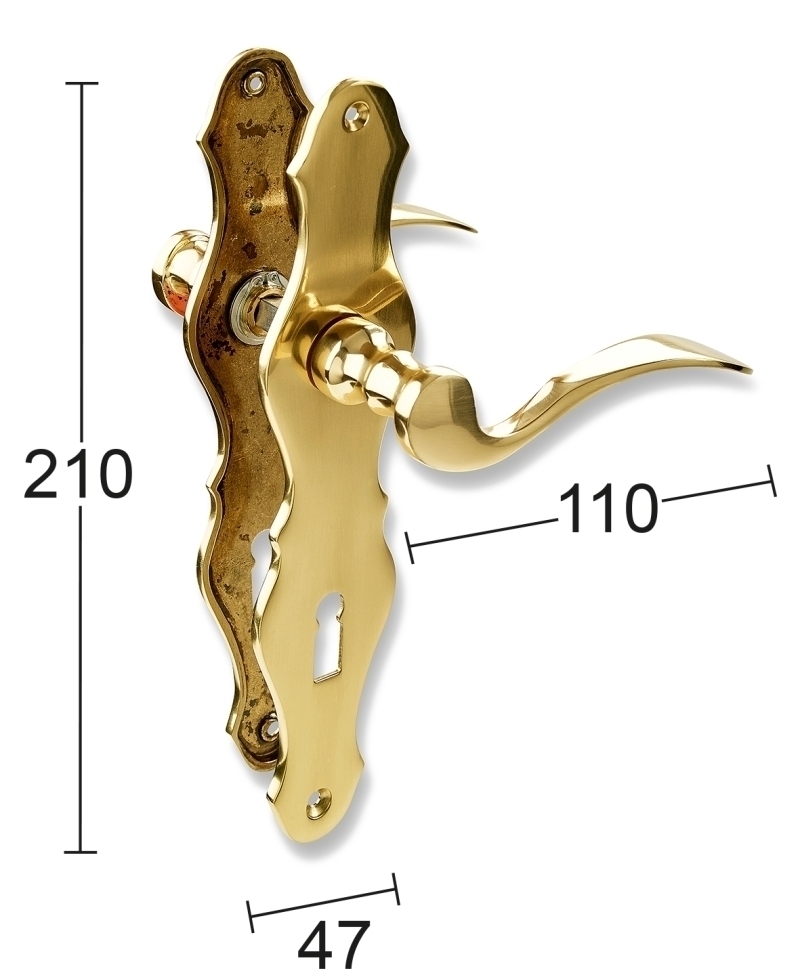 Deurkruk van messing. Klassieke deurkruk met gegoten langsplaat, past goed in oude huizen. Voor binnendeuren van 38-42 mm. Uitsprong 65 mm.