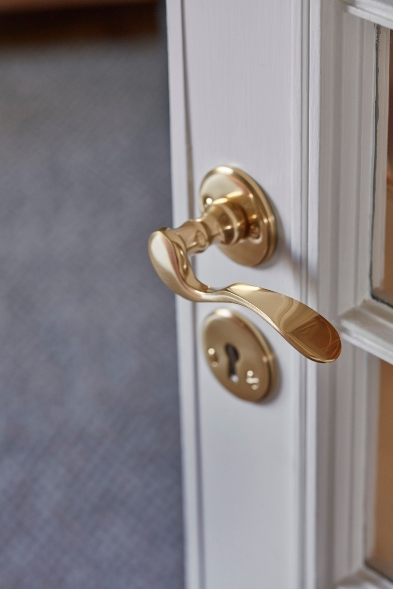 Deurkruk van messing. Elegante, traditionele deurkruk met een goede grip. Voor binnendeuren van 38-42 mm. Uitsprong 58 mm.