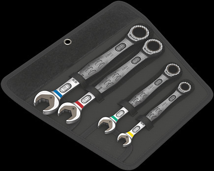 Sneller, beter, mooier. Gewoon een echte joker. De nieuwe generatie vorkringratelsleutels. Set in 4 delen in stevige tas. Voor zeskantschroefkoppen of -noten. Met vasthoudfunctie via een metalen plaat in de vork, waardoor de kans op vallende schroeven en moeren wordt verkleind. De vervangbare metalen plaat in de vork houdt schroeven en moeren met extra harde tanden vast en vermindert het risico op uitglijden. De geïntegreerde eindstop kan het naar beneden glijden van de schroefkop voorkomen en het aanbrengen van grotere draaimomenten mogelijk maken. De dubbele zeskantgeometrie zorgt voor een nauwsluitende verbinding met schroef en moer, waardoor het risico op wegglijden wordt verminderd. Een terughaalhoek van slechts 30° aan de vorkzijde voorkomt het tijdrovende draaien van de sleutel bij het schroeven. Ratelmechanisme aan de ringzijde met uitzonderlijk hoge fijne vertanding van 80 tanden zorgt voor flexibiliteit in krappe montagesituaties. De speciale smeedgeometrie zorgt voor een hoge koppeloverdracht en een hoge buigsterkte. Vervaardigd uit hoogwaardig chroom-molybdeenstaal met nikkel-chroomcoating voor hoge corrosiebescherming. Met de Take it easy toolfinder: Kleurmarkering op maat.