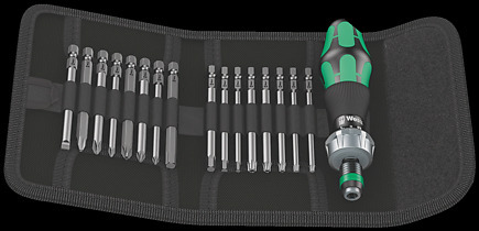 Set in 17 delen met 89 mm lange bits in praktische vouwtas. Met 1 handtak 816 RA Powervorm met ratelfunctie: fijne vertanding voor kleine terughaalhoek, schakelring (rechts, vast, links), maximaal koppel tot 50 Newtonmeter. 1/4" interne zeskantaansluiting met Rapidaptor-technologie voor minder vermoeiend werken en bliksemsnelle bitwisseling. Magnetisch.