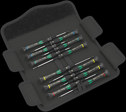 Wera Micro-schroevendraaiers in sets voor fijnmechanisch schroeven. Door de hand op de draaikap te steunen en via de bliksemdraaizone onder de draaikap is het mogelijk om razendsnel rond te draaien. Tijdrovend om een nieuwe bewoner aan te pakken. Opbergen en transporteren in een robuuste heuptas, zodat het gereedschap altijd bij de hand is.